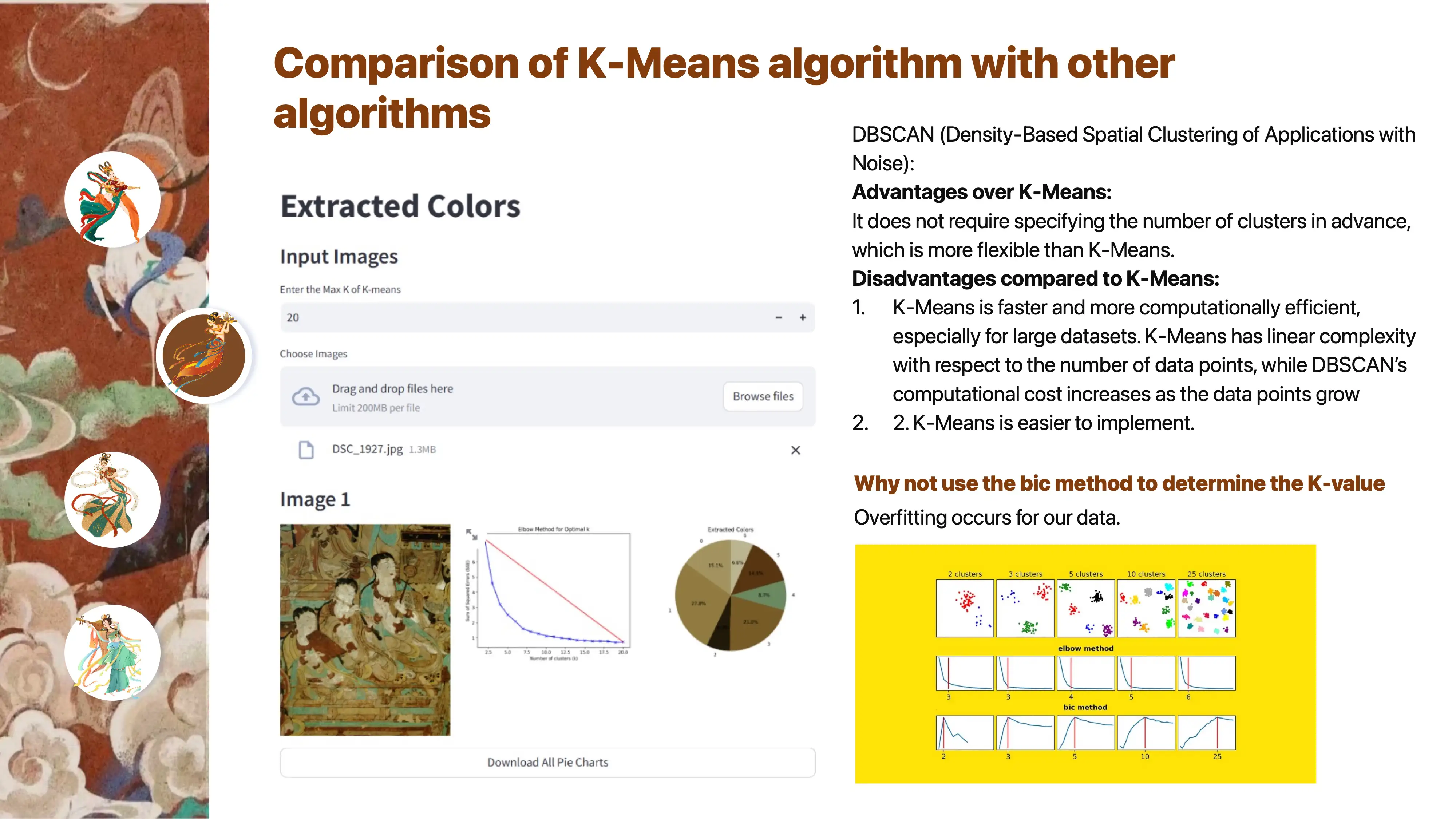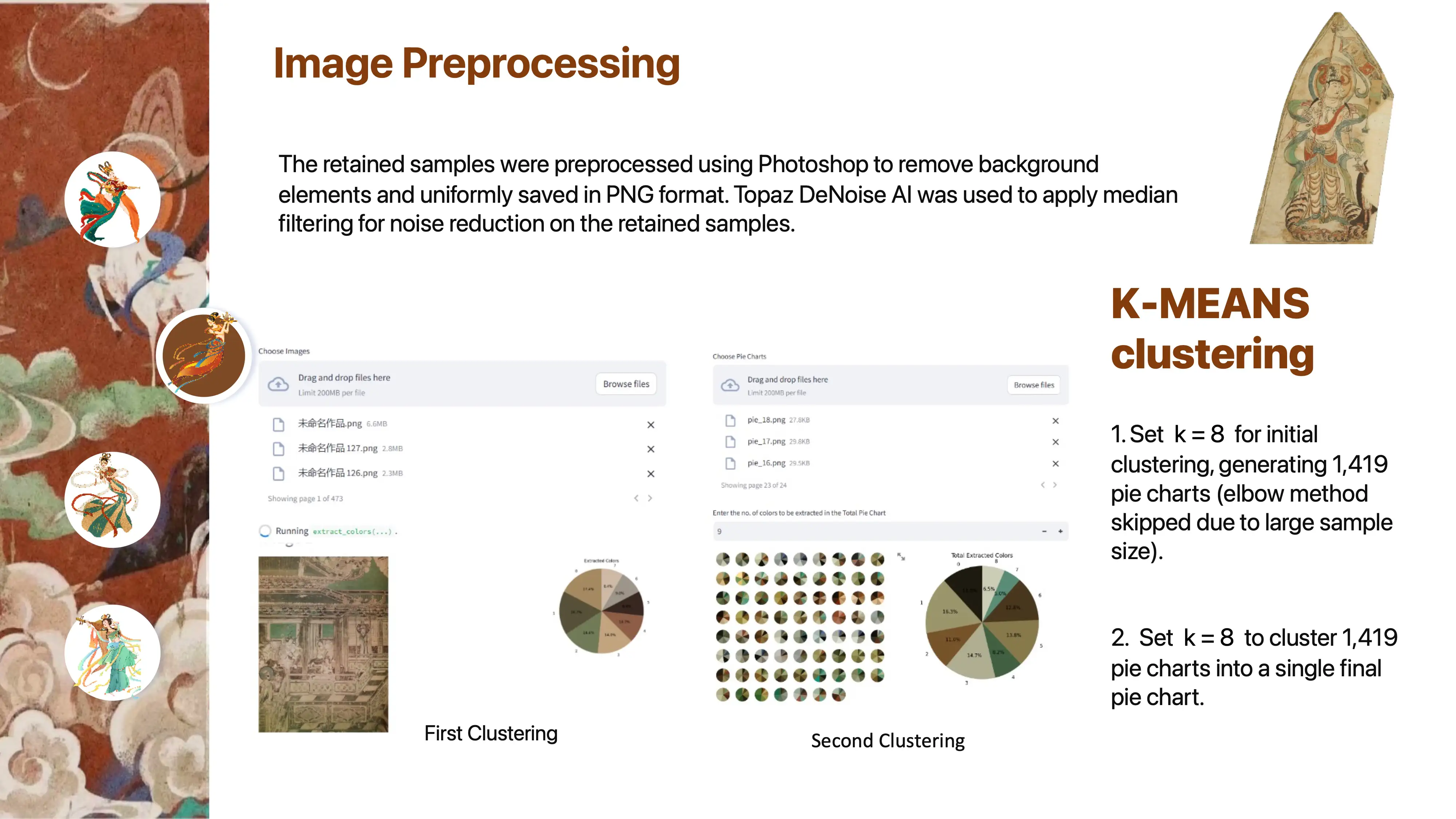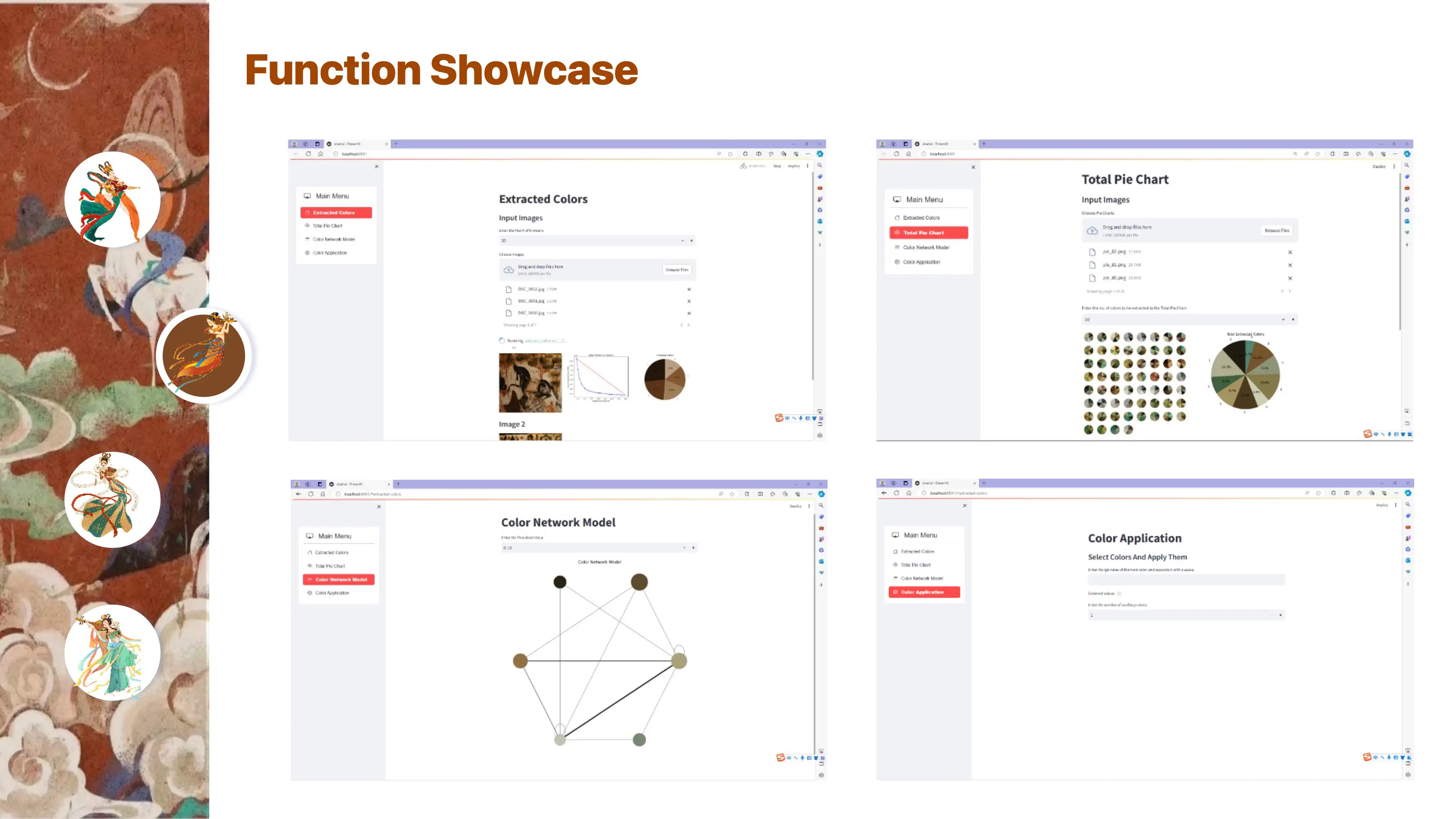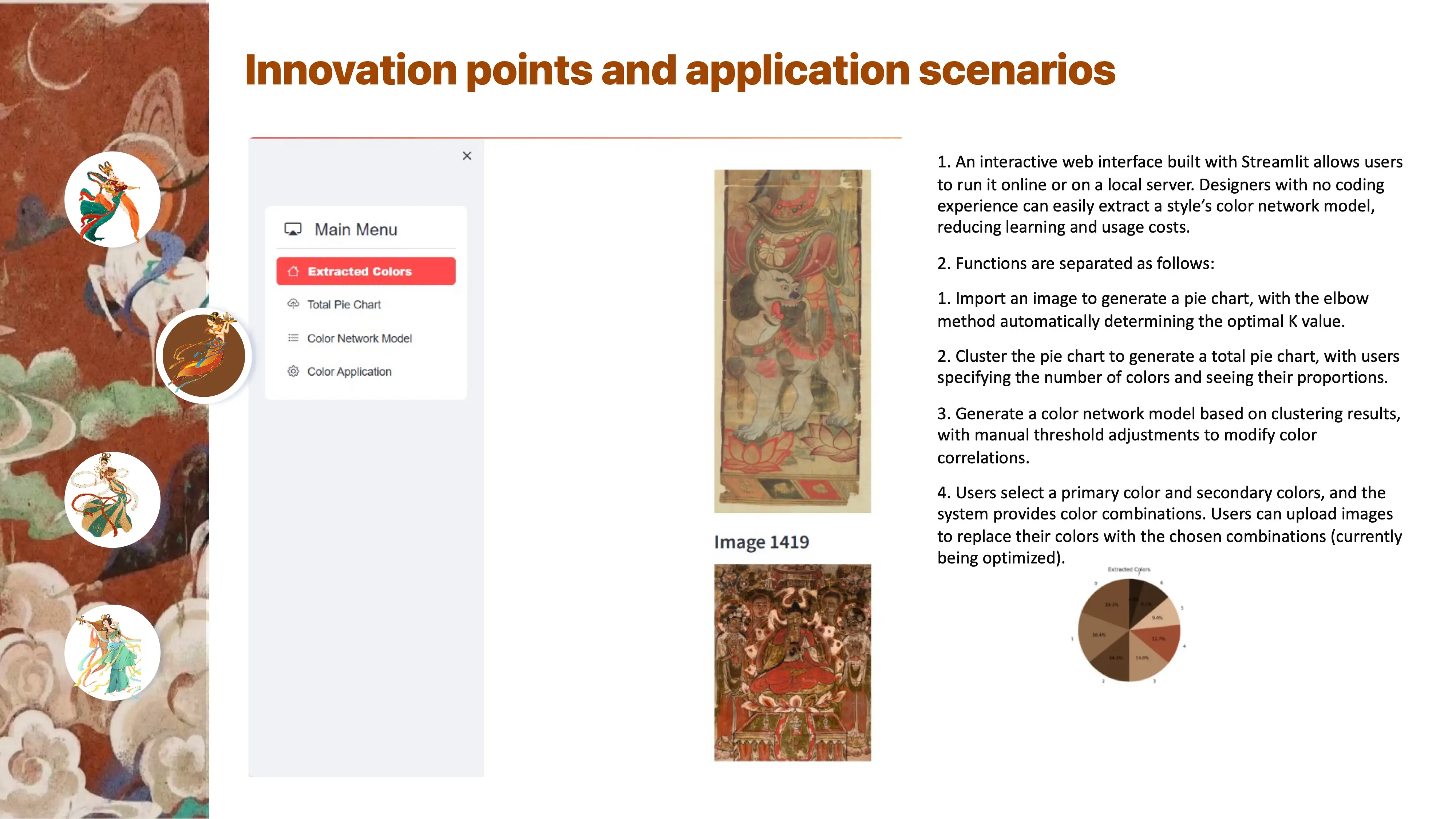 The color network model can use k-means clustering to images and create color pie charts. These pie charts are then used to develop a color network model that explores the color combinations and patterns within a specific type of image. After the color network model is formed, the program allows you to select a color and provides color combination suggestions. You can also input a new image, and the program will replace the colors in the image based on the suggested color combinations.