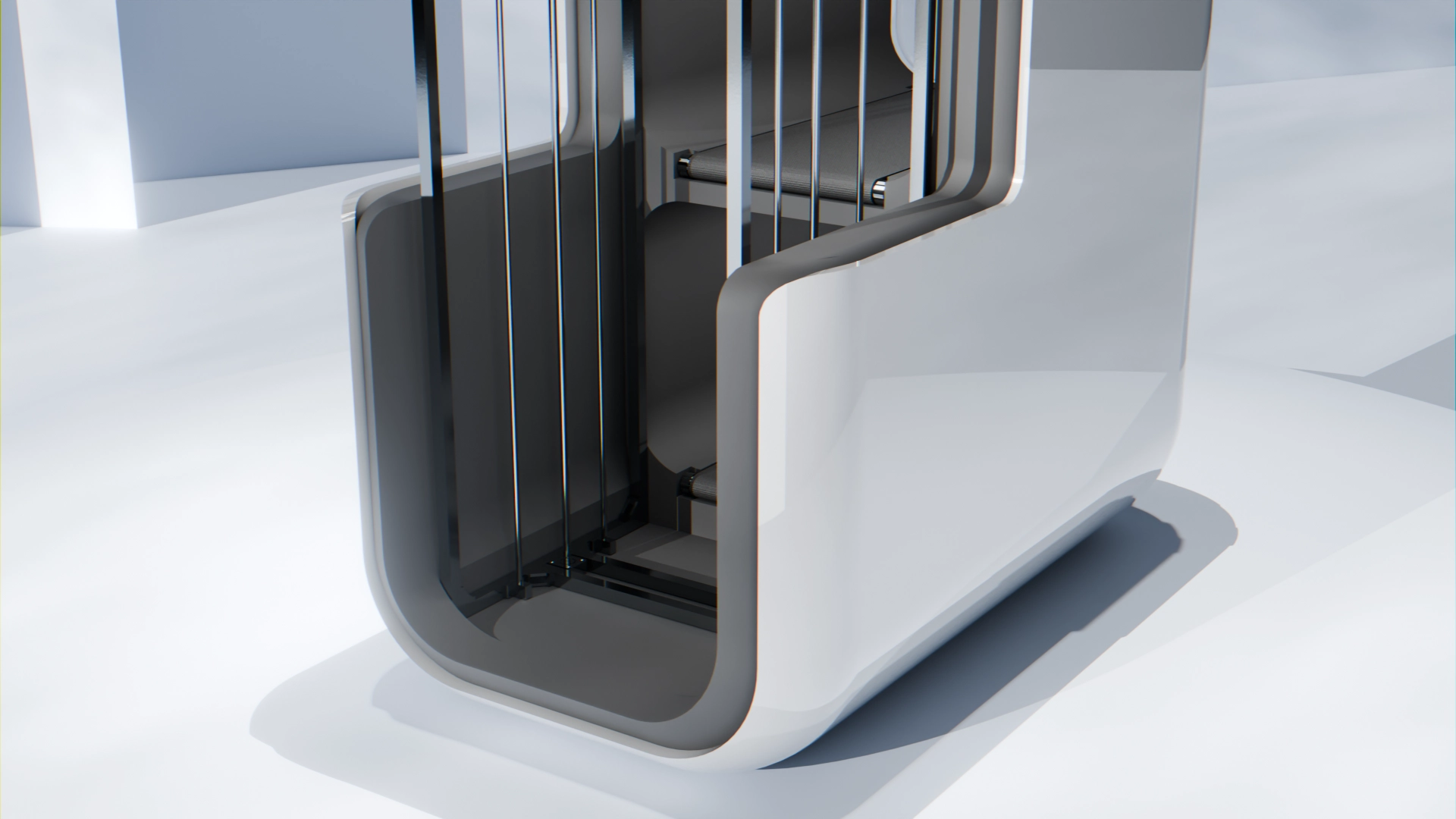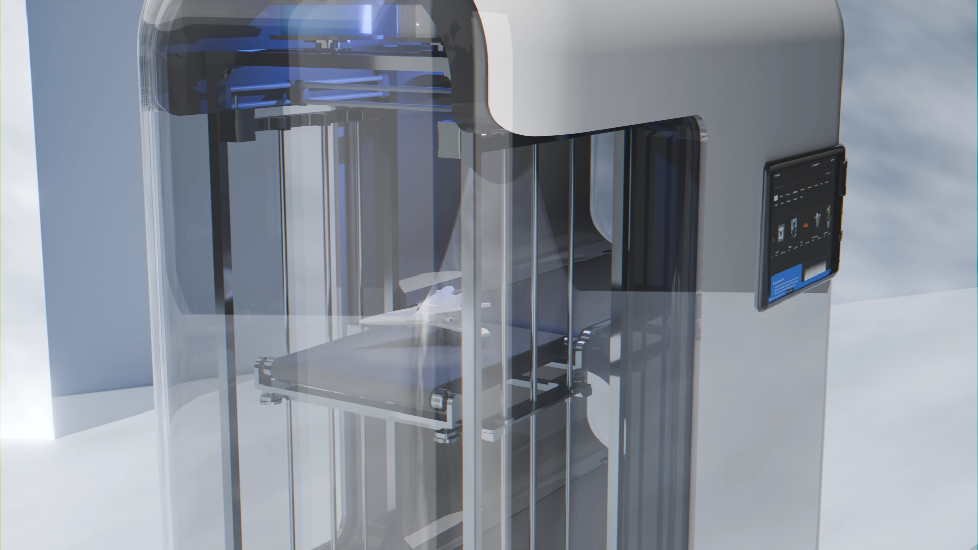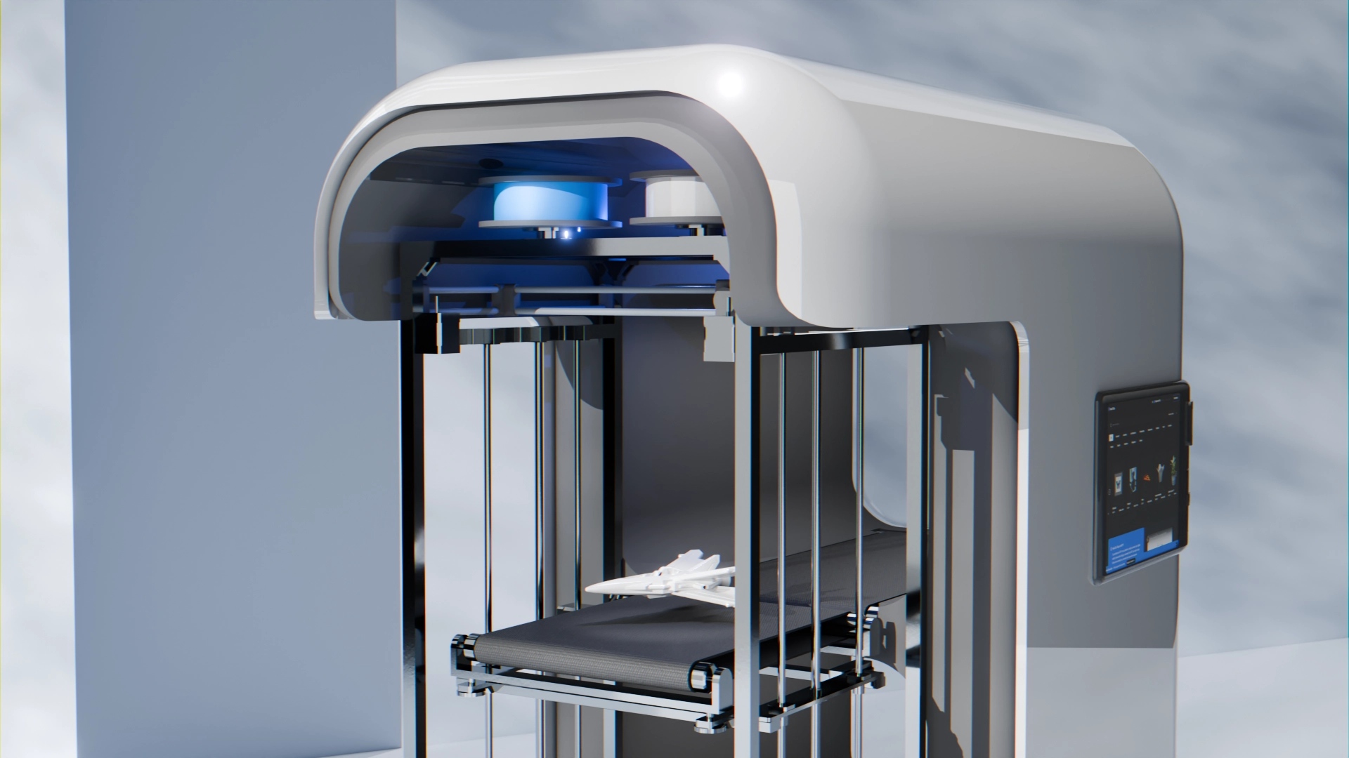 Uses FFF (Fused Filament Fabrication) printhead with precise X/Y/Z motion. Horizontal conveyor transports finished prints to the storage side.