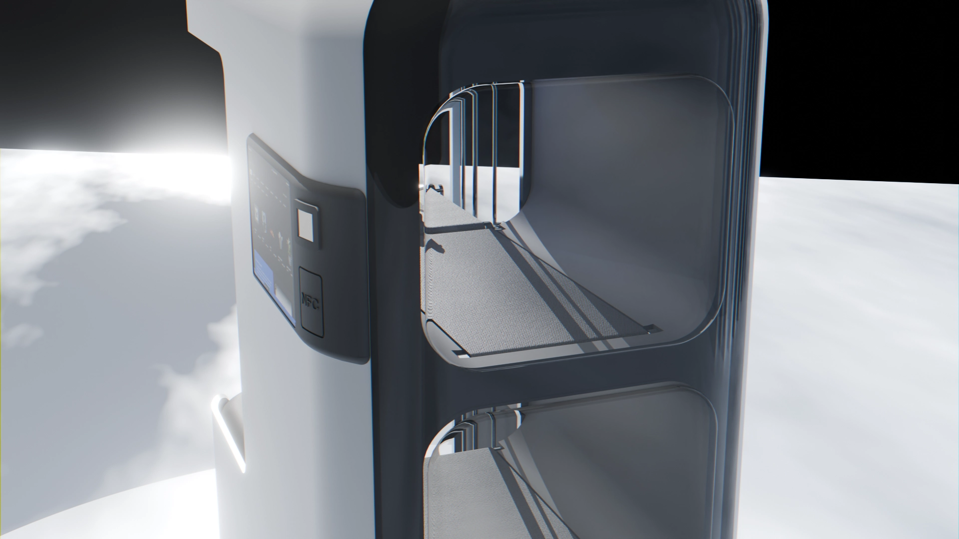 Multiple independent shelves, each receiving printed items from the left conveyor. Combining rapid pickup with categorized storage for user self-service. A touchscreen provides model selection, status monitoring, and control.